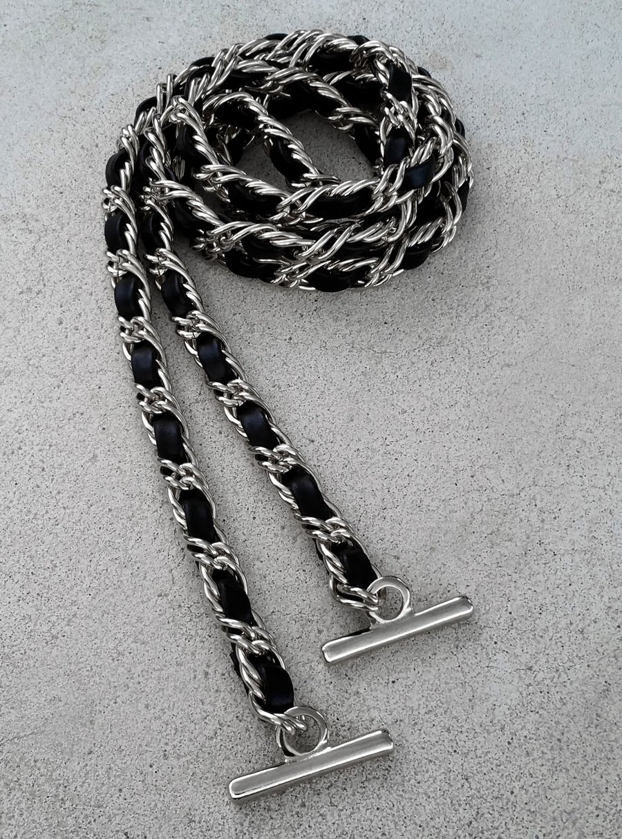 Petite NICKEL Chain Strap with Leather Weaved Through - Double Curb Chain - Choice of Length & Hooks