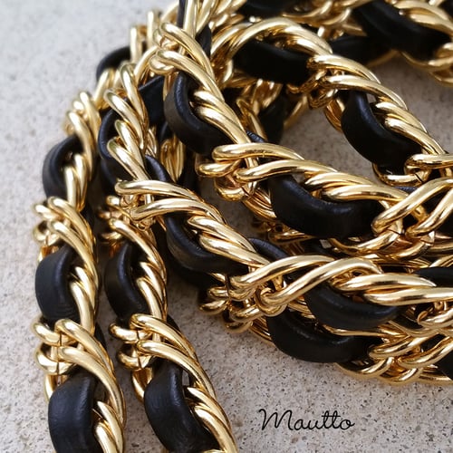 The chain with leather weave provides a fashionable and elegant look, often seen on luxury handbags (Chanel, Marc Jacobs, Mulberry, for example). This strap can be added easily to most handbags using your choice of attachable hooks.